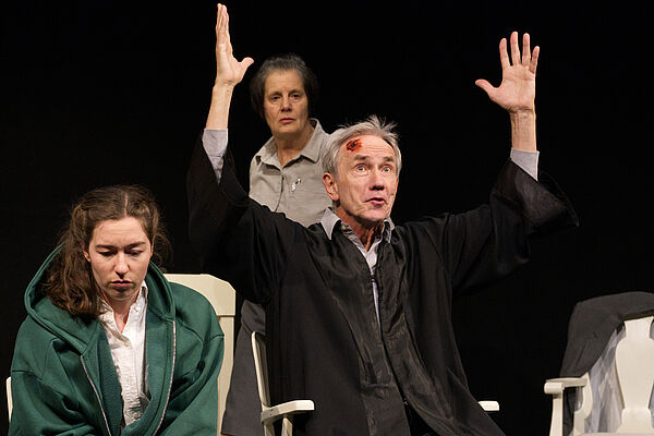 Walter Menzlaw von Chawwerusch inszenierte den Kleist-Klassiker „Der zerbrochne Krug“ in einer zeitgemäßen „puren“ Inszenierung, die sich auf die zentralen Fragen des Stoffs konzentriert. Drei Schauspieler*innen (Felix S. Felix, Ben Hergl und Lina Zimmer) spielen die komische wie abgründige Geschichte vom schwärzesten Tag des Dorfrichters Adam. Morgens erwacht er mit Kopfschmerzen, seine Perücke ist nicht zu finden und dann muss er sich auch noch durch einen äußerst delikaten Gerichtsfall hangeln, immer unter der strengen Aufsicht der Gerichtsbarkeit aus der Stadt, die gekommen ist, um ihm auf den Zahn zu fühlen. Witwe Marthe ist außer sich. Bis gestern war ihre kleine Welt noch in Ordnung: Sie lebte mit ihrer bereits verlobten Tochter im eigenen Haus, und ihr Familienerbstück, der Krug, stand unversehrt auf der Fensterbank. Doch plötzlich ist alles aus dem Lot geraten: Ihre Tochter Eve wurde am späten Abend mit ihrem Verlobten Ruprecht im Garten gesehen. Kurz darauf war der Krug zerbrochen – Grund genug für Marthe, vor Gericht zu ziehen. Der alte Dorfrichter Adam soll alles wiederherstellen: Den rechten Sachverhalt, Genugtuung für den entstandenen Schaden – und nicht zuletzt die Ehre von Tochter Eve. Es ist eine scheinbar heile Welt, die hier aus den Fugen gerät: Im abgelegenen Dorf galten bislang die überlieferten Regeln der Dorfgerichtsbarkeit. Doch mit dem seltsamen Verhalten von Dorfrichter Adam, seinem ständigen Vor und Zurück und seinen Versuchen den wahren Sachverhalt im Dunkeln zu belassen, liegt am Ende nicht nur der Krug, sondern auch das Vertrauen in die Gerichtsbarkeit in Scherben. Die Konzentration auf das Wesentliche des Stoffes lenkt den Blick auf die Abgründe, die sich im scheinbar idyllischen Dorfleben auftun: Macht wird nicht zum Wohl der Dorfgemeinschaft ausgeübt, sondern im Verborgenen schamlos für eigene Wünsche missbraucht. Und doch bleibt „Der zerbrochne Krug“ eine Komödie, weil die feingebaute Geschichte und der Kleist‘sche Sprachwitz fortwährend für urkomische Situationen sorgen.